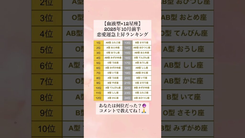 チャンネル登録で恋愛運が急上昇するよ!💞【血液型×12星座】2025年10月前半恋愛運急上昇ランキング あなたは何位だった?🔮 コメントで教えてね!🙏 #shorts #血液型占い #占い yoshihara 1か月前