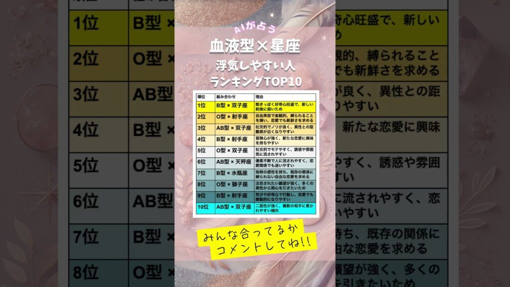 【血液型×星座】浮気しやすい人ランキング #shorts #恋愛 #占い #血液型占い #星座占い