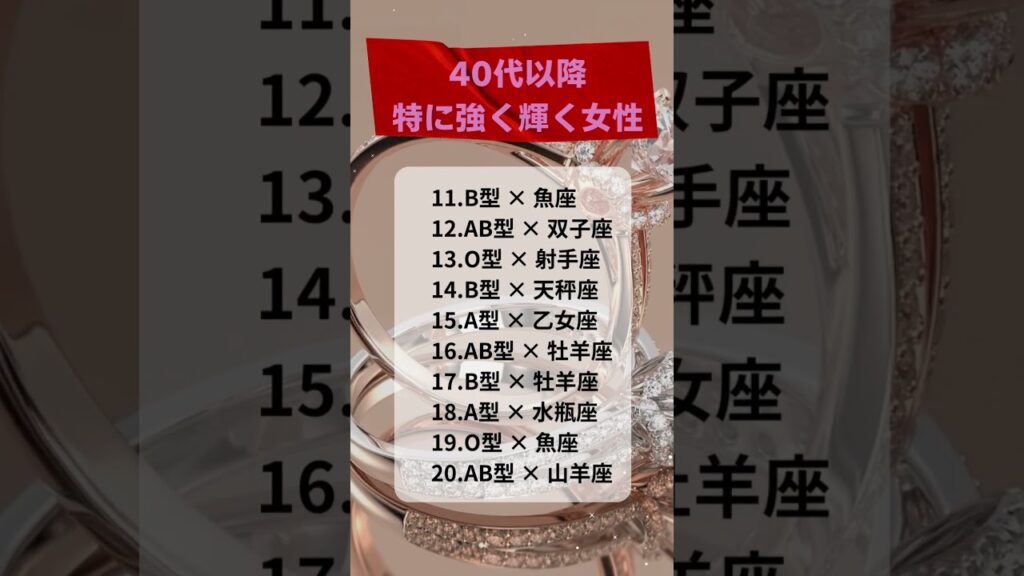 #40代からの魅力 #星座占い #血液型診断 #大人女子 #大人の恋愛 #成熟した女性 #人生の花が咲く #しなやかな強さ #年齢を重ねる美しさ #内面の輝き