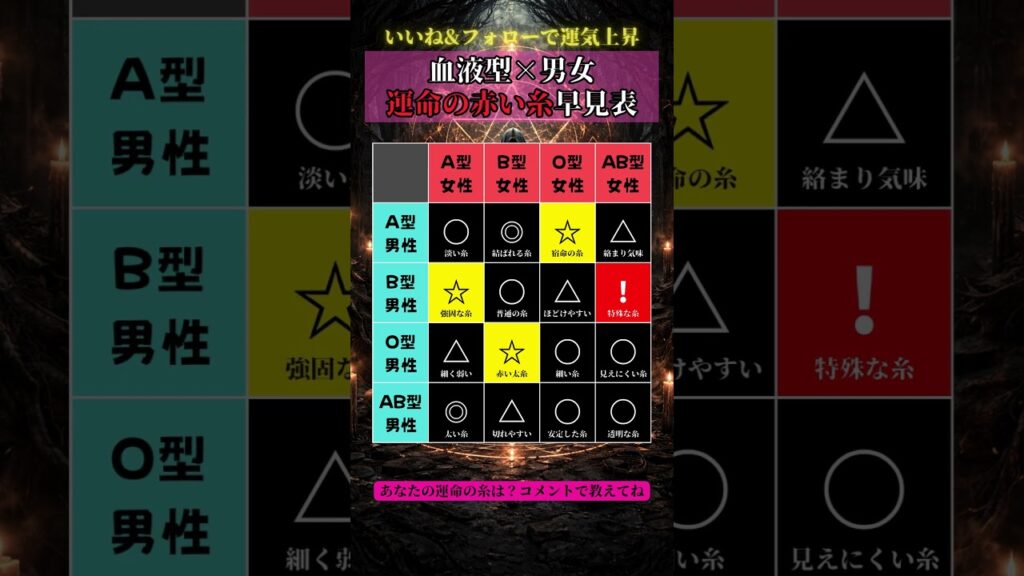 血液型×性別で分かる運命の赤い糸✨ 目に見えない魂の繋がりを読み解きます。 二人を結ぶ糸の強さは? もっと詳しく知りたい方はプロフ見てね🔮 #血液型占い #運命の赤い糸 #魂の繋がり #相性占い yoshihara 2日前