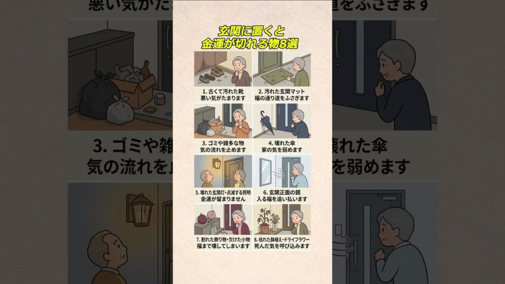 玄関に置くと金運が切れる物8選 #風水 #玄関風水 #金運 #金運アップ #開運 yoshihara 1日前 玄関は運気の入口とも言われ、 置く物ひとつで家の空気が変わることがあります。 今回は、金運や福を遠ざけやすい 玄関の物を8つに絞ってわかりやすくまとめました。 気になる物があれば、今日から少しずつ見直してみてください。 #風水 #玄関風水 #金運 #金運アップ #開運 #運気アップ #運気改善 #玄関 #片付け #断捨離 #玄関掃除 #気の流れ #福を呼ぶ #家を整える #開運習慣 #シニアライフ #老後の暮らし #すっきり暮らす #暮らしを整える #縁起