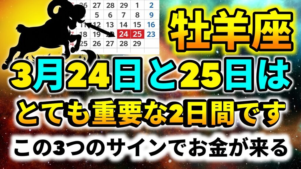 【牡羊座】3月24日と25日は最も重要な2日間|この3つのサインでお金が入る|今日の星座占い yoshihara 17時間前 3月24日と25日は、牡羊座にとって非常に重要な2日間です。この期間には特別なエネルギーが流れており、あるサインに気づくことで金運が大きく変わる可能性があります。 この動画では、牡羊座の方が見逃してはいけない「3つのサイン」について詳しく解説しています。これらのサインを正しく理解することで、これまでの苦しみが終わり、お金の流れが良くなるかもしれません。 ぜひ最後までご覧ください。 今日の星座占い|今日の運勢|牡羊座の運勢|金運アップ|開運|成功のサイン