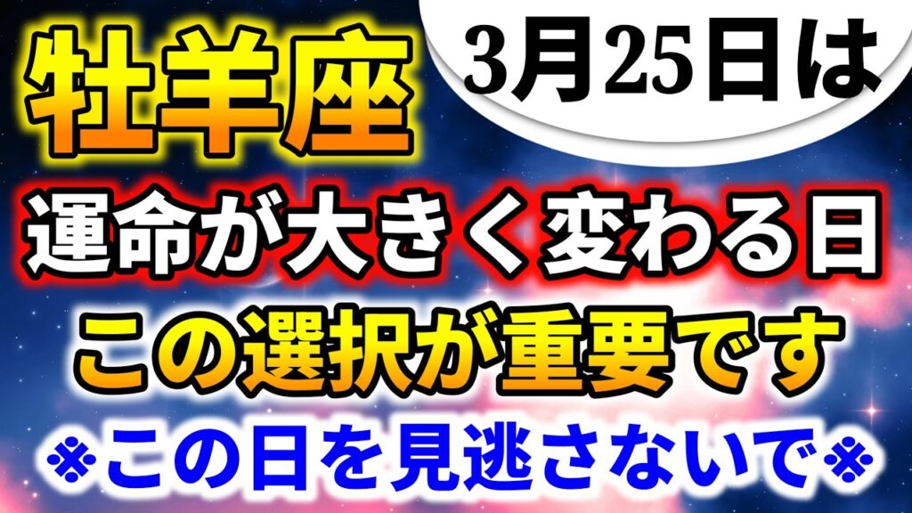 【牡羊座】3月25日運命が大きく変わる日|この選択が未来を左右する|今日の星座占い yoshihara 1日前 3月25日は、牡羊座にとって運命が大きく動く特別な一日です。この日にどのような選択をするかによって、今後の未来が大きく変わる可能性があります。 この動画では、牡羊座の運勢や、この日に特に意識してほしい重要なポイントについて詳しく解説しています。正しい選択をすることで、運気が上昇し、良い流れを引き寄せることができるでしょう。 ぜひ最後までご覧ください。 今日の星座占い|今日の運勢|牡羊座の運勢|開運|運命|重要な日
