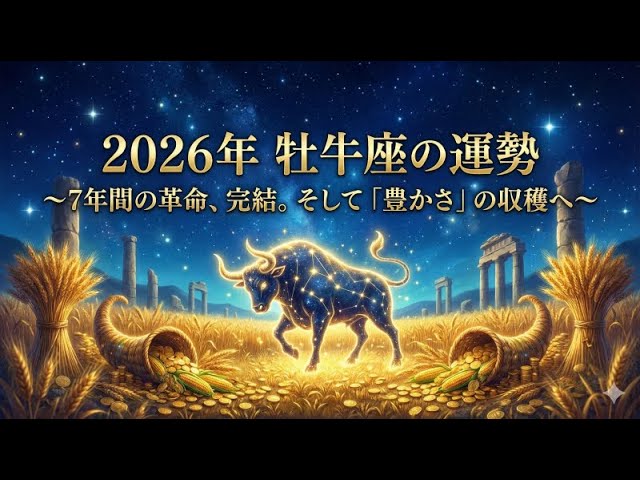 ▼目次 00:00 オープニング・激動のフィナーレ 02:10 7年間の革命があなたに残したもの 05:30 2026年の全体運:「収穫」のフェーズへ 08:15 金運・仕事運:桁違いの豊かさを受け取る 11:00 恋愛・対人運:安定と安らぎの再来 14:20 豊かさを余さず受け取るための儀式